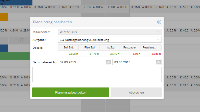 - Aufgaben planen: Wenn die Funktion “Plandaten” aktiviert ist, werden anstehende Aufgaben angezeigt.